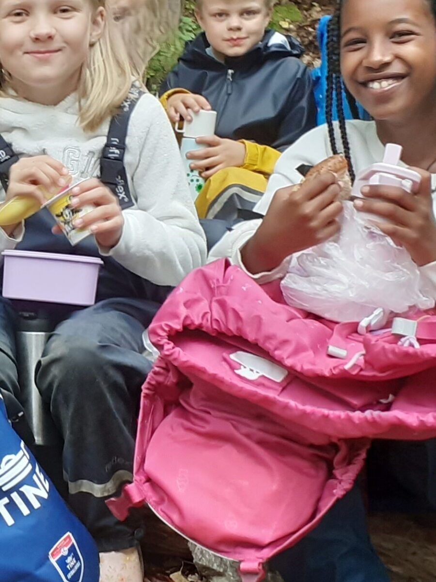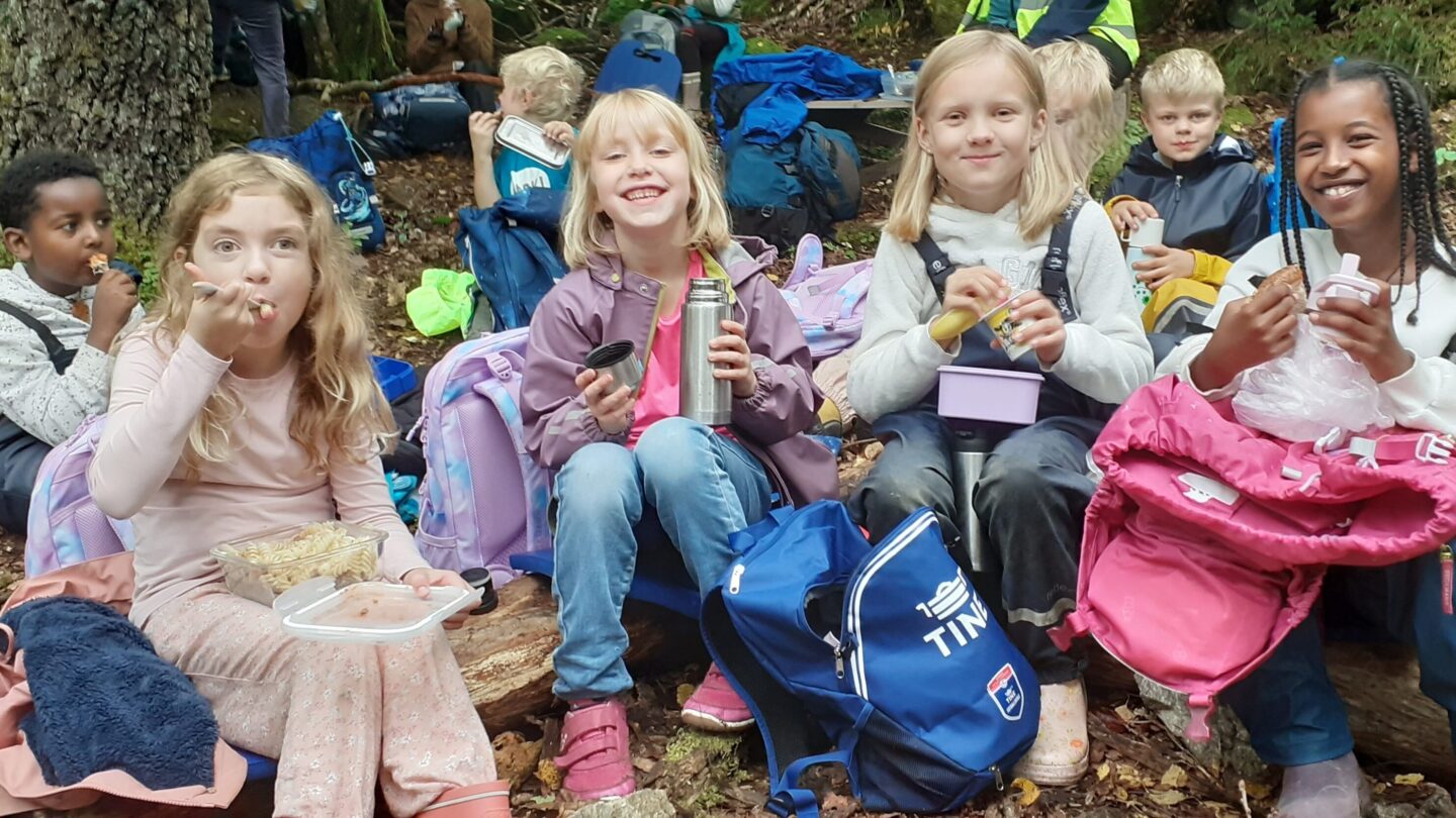 Andre er satt der av skaperen selv. Et mylder av ulike skapninger gjemmer seg. Løfter du på en sten, kan du finne mye rart som kravler, kryper og snor seg. Og hvis du er heldig, kan du kanskje finne en glinsende, lilla bille. Den blir behandla varsomt på et digert hasselbuskblad. Studeres inngående av nysgjerrige øyne og fingre, før den forskremte stakkaren endelig blir sluppet fri til å fortsette på dagens gjøremål.  Andre skatter blir båret hjem i magasekken. Bær plukkes med hendige fingre, og puttes rett i munnen. Ikke noe behov for kopp eller bøtte her. En stor favoritt er markjordbæra. Dem er det ikke så mange ta, men til gjengjeld er de ganske så små. Kanskje er det derfor de smaker så ekstra godt, når en endelig finner noen. Men bæra kommer ikke før utpå sensommeren og høsten, så ventinga kan bli lang. Fram til de begynner å vise seg, kan en drøye tida med gjøkesyre. Den dukker opp allerede i mai, og står der fremdeles når ungane kommer tilbake etter en lang sommerferie. Bare ingen tråkker den ned først. Den gjør ikke så mye ut av seg, der den står i skyggen under trea, gjøkesyra. Om en ikke skulle ha hellet med seg, eller ikke er av den foretaksomme typen, smaker det alltid helt fortreffelig med medbrakt nistepakke når en er ute blant granleggane. Spesielt hvis en har huska å ta med litt varm kakao i sekken. Da er det rent så en glemmer at en er på skolen, når en har noe godt å drikke og ei nistepakke å gnaga på.