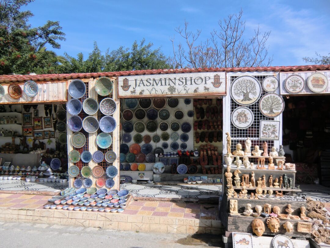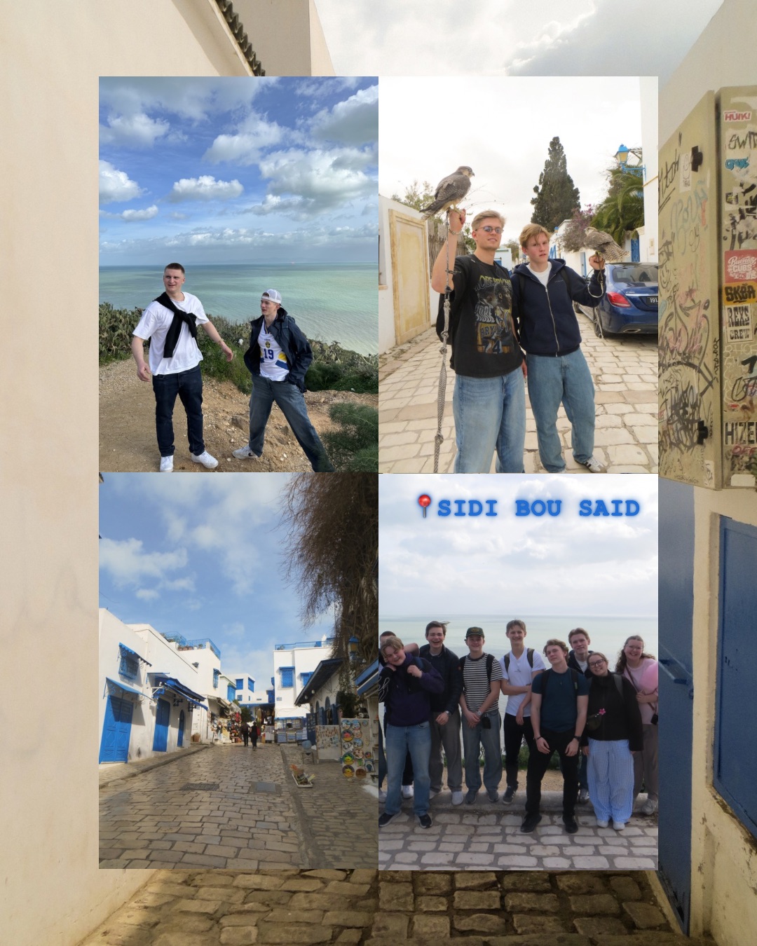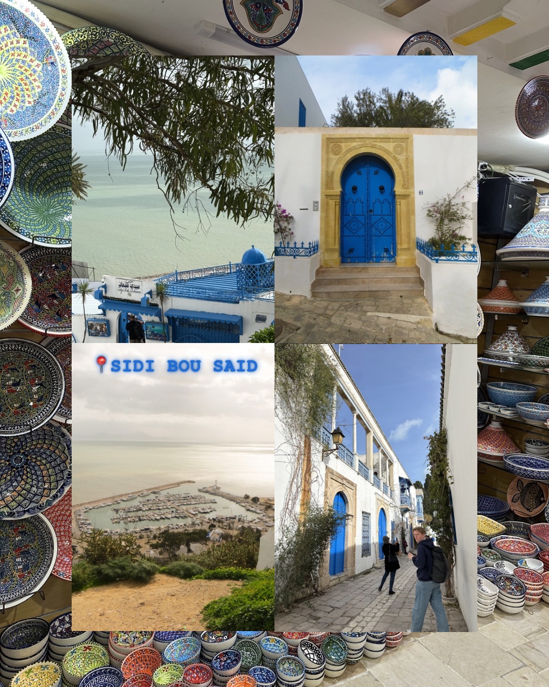 Senere dro vi til Sidi Bou Said – den berømte blå-hvite byen ved Middelhavet. Med hvitkalkede hus, blå dører og smale gater var det nesten som å gå rundt i et postkort. Noen av oss ble riktignok litt rundlurt av en lokal selger som plutselig plasserte fugler i hendene våre for et bilde – tunisere kan virkelig sine salgstriks.