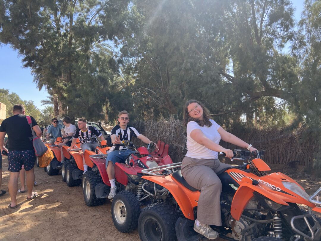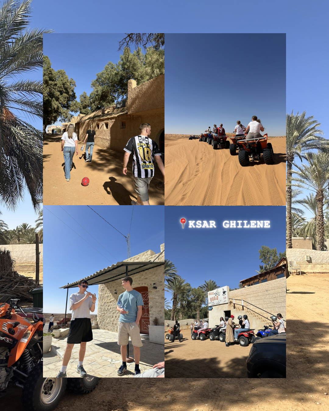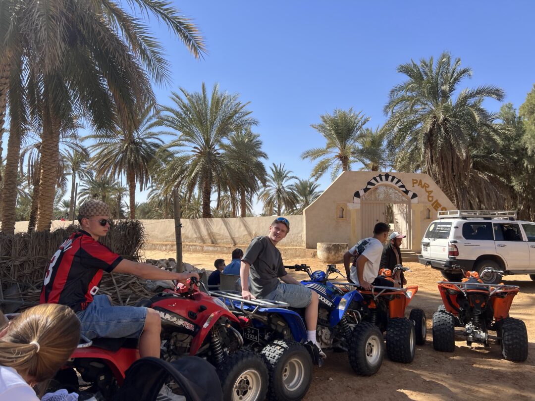 Målet var Ksar Ghilane – en oase midt ute i Sahara. Der ventet sand så langt øyet kunne se, og ikke minst ATV-kjøring gjennom ørkenen. Det viste seg raskt at sanddyner er enda morsommere når man kan suse opp og ned på fire hjul. Etterpå badet vi i varme kilder midt i oasen. Vannet var riktignok så varmt at flere lurte på om man egentlig ble mer avkjølt av å ikke bade.