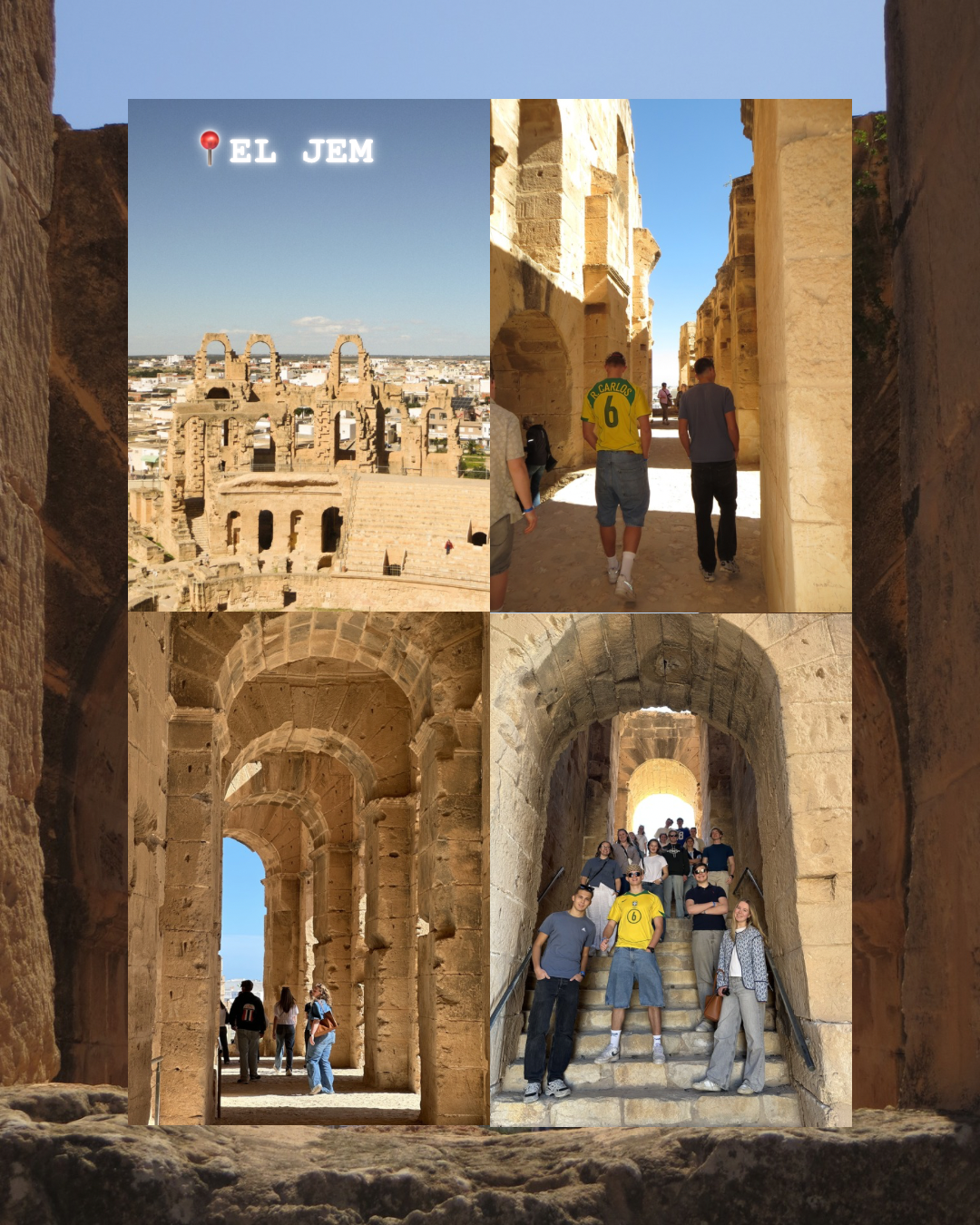 Fredag formiddag dro vi til El Jem, hvor vi besøkte et imponerende og svært godt bevart amfiteater. Det minner mye om Colosseum i Roma, bare at her kan man fortsatt vandre rundt og virkelig kjenne historiens sus. Vi fikk høre flere sterke historier om de første kristne og martyrer som ble sendt inn i arenaen. Etterpå besøkte vi et mosaikkmuseum med vakre og imponerende kunstverk fra romertiden.