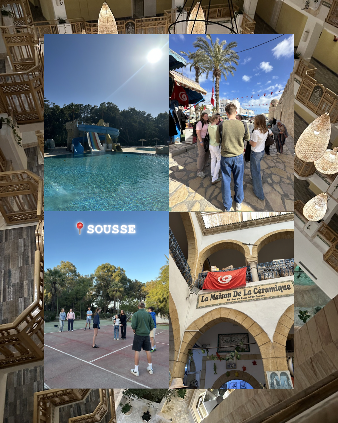 Torsdag ettermiddag ankom vi hotellet i Sousse – hotellet mange hadde gledet seg ekstra til. Her var det både utendørs- og innendørsbasseng, treningsrom, fotballbane, tennisbane og – til stor jubel – varmt vann i dusjen! Men aller viktigst: all inclusive. Buffeten bugnet av mat fra alle verdens hjørner. Og hva valgte mange av oss? Tunisisk mat, selvfølgelig. Noen gikk så ivrig til verks at det nok satte sine spor.