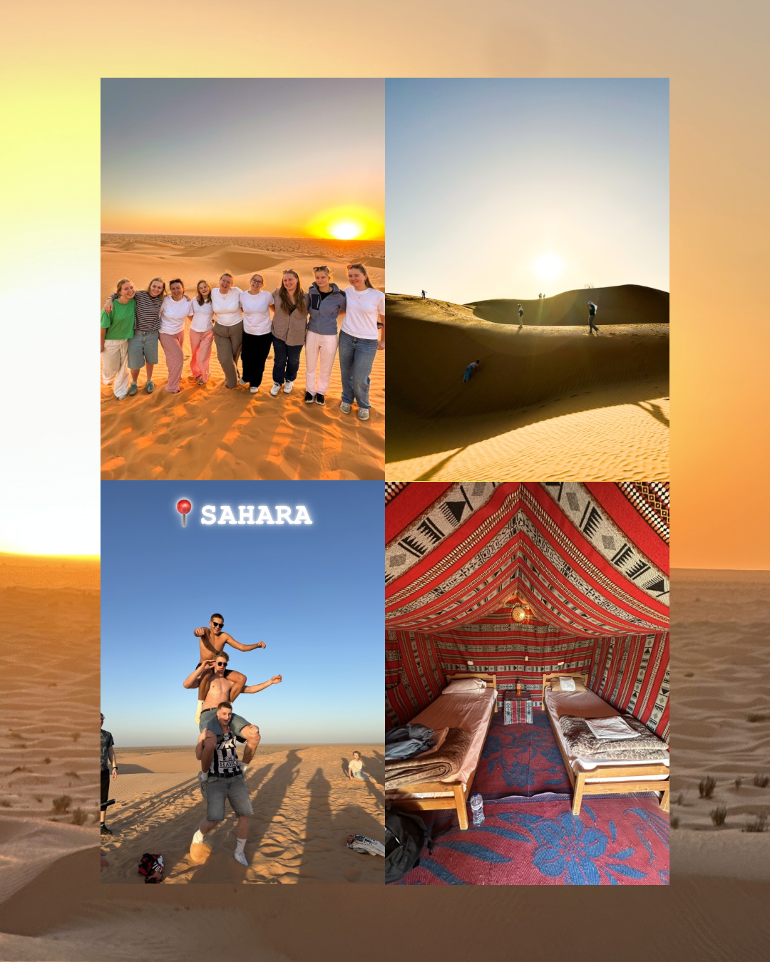 Etter et veldig godt måltid gikk turen videre – nå i Land Cruisere, dypere inn i ørkenen. Spørsmålet var bare: hvor skulle vi egentlig? Svaret var en ørkencamp. Natt til torsdag sov vi i telt på Campement Zmela, midt ute i sandhavet. Det var en ganske heftig opplevelse: sand overalt, stjernehimmel over oss og en kveld fylt av latter. Underholdningen sto vi nemlig for selv, med et klassisk “ørkenshow” fra ungdommene – inkludert konkurranse der gutta til slutt kunne gå seirende ut.