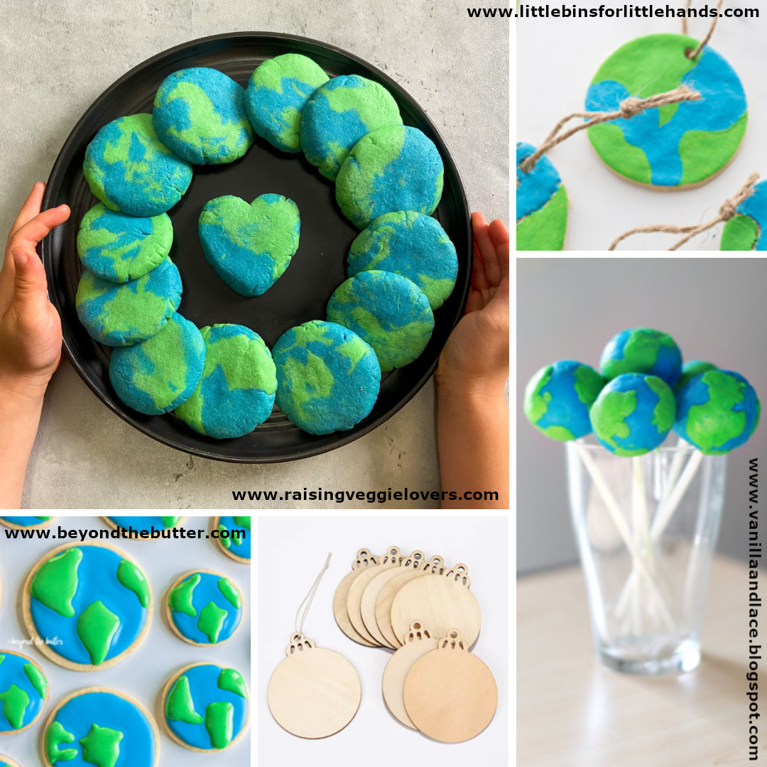 • Oppskriften til «cake pops» som ser ut som jordkloden (nederst til høyre) finner du her, men enda enklere vil være å lage marsipankuler som ser ut som kulene på bildet – med eller uten pinne. Fargelegg da marsipan med konditorfarge (bruk ikke vanlig konditorfarge men pastafarge eller gelfarge) og rull sammen små jordkloder.