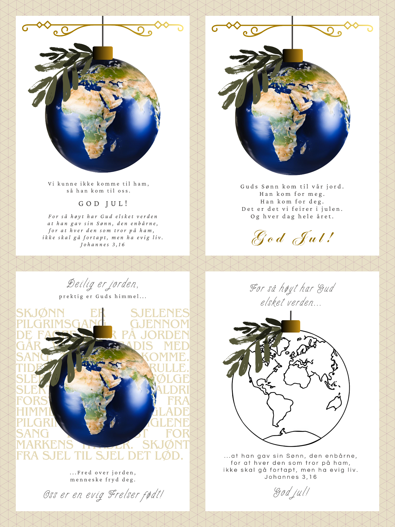 Disse ressursene kan skrives ut fritt og brukes sammen med det barna har laget. Julekortene og gavelappene kan gjerne skrives ut på fotopapir eller på litt tykk ark. Julekortet med verden i svart/hvitt bør ikke skrives ut på fotopapir, da det er meningen av barna skal kunne fargelegge kortet selv. Dette kortet kan du gjerne skrive ut på litt tykkere ark, eller på kopipapir som du/barna limer på blå/grønn kartong.