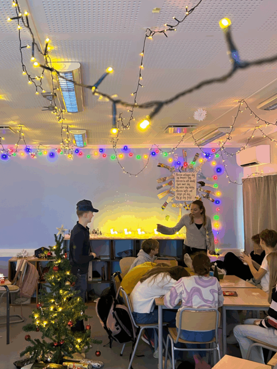 Snart skal vi ha juleverksted. Da skal det være stasjoner i nesten alle klasserommene der man kan lage julepynt og julegaver. På kjøkkenet er det pepperkakebaking, i gymsalen er det ofte volleyball og i et av klasserommene er det film.