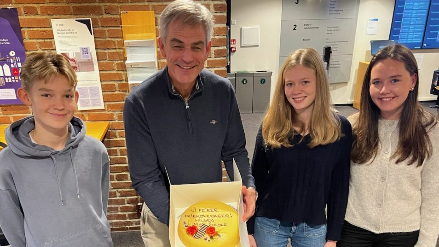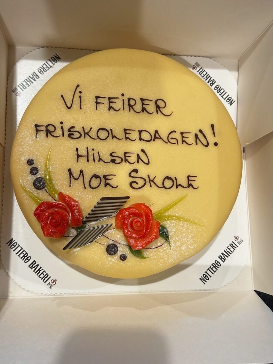 I år markerte Moe skole denne dagen ved at noen fra elevrådet reiste ned til rådhuset med marsipankake. Med seg hadde de et brev der mange elever hadde skrevet hva de synes er fint med skolen vår. Det kom dessverre ingen journalister, men ordfører Bjørn Ole Gleditsch kom og tok imot gaven, og ga seg tid til en hyggelig prat med rektor og elevene.